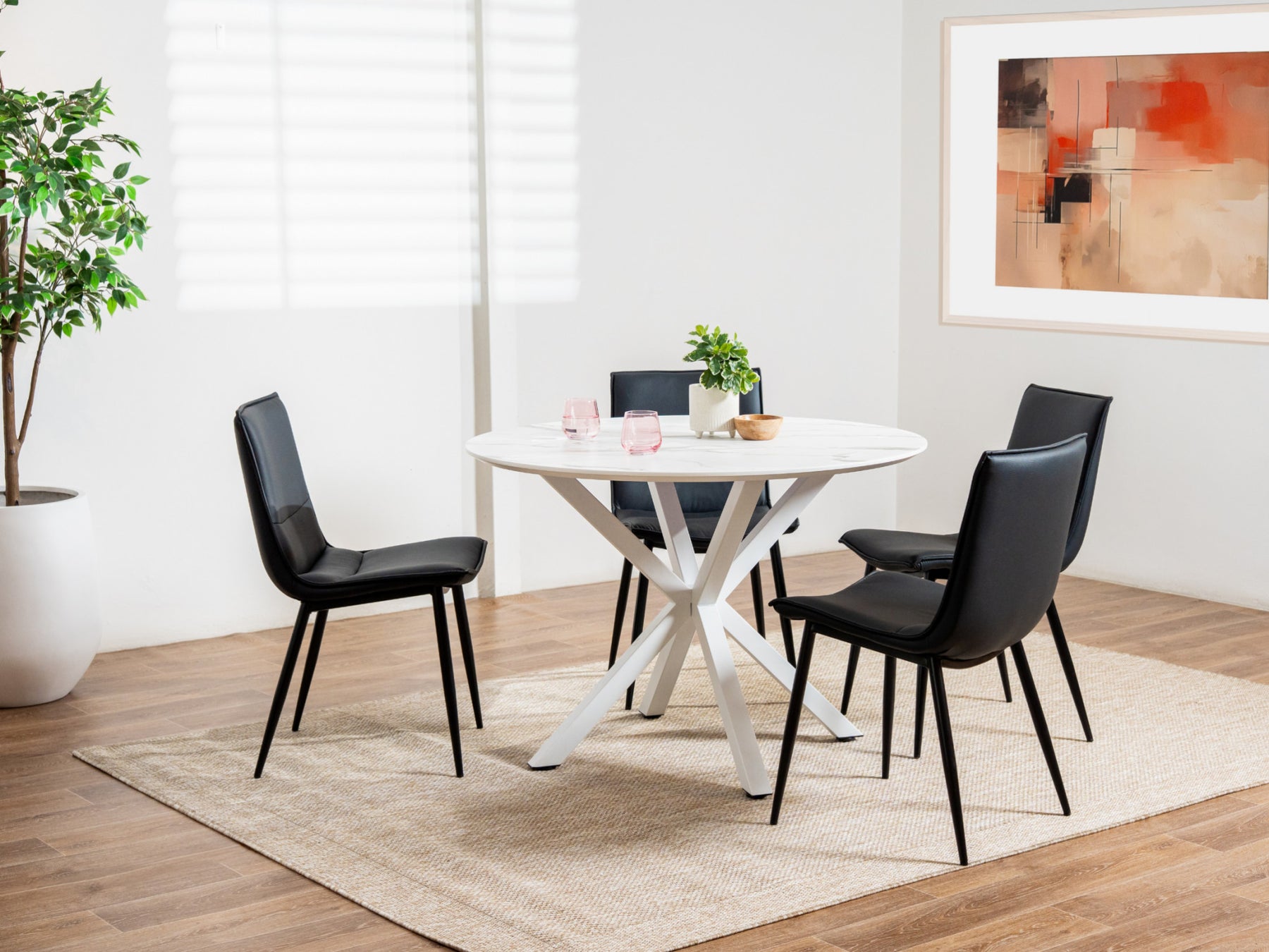 Introducing the Black Royce Faux Leather Dining Chairs (Set of 2). This attractive chair is perfect for any dining room, as it combines style and comfort in its design. The frame is made of black powder-coated steel, giving it a modern look that's sure to bring a contemporary touch to your space. Its upholstery is available in either textured boucle fabric or PU, so you can choose whichever option works best for you and your decorating preference. This chair has a supportive back shape and padded seat cushion, providing maximum comfort while you dine with family or friends. Not only does this chair look great, but its lightweight design makes it easy to move around if needed.