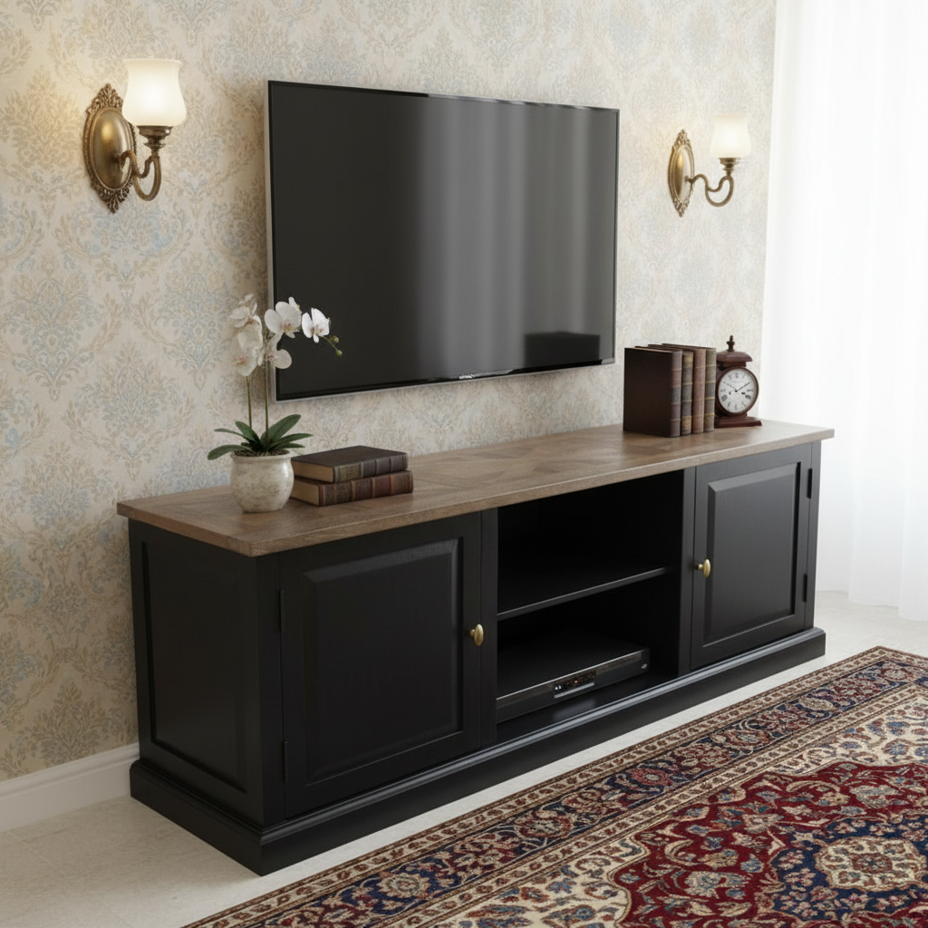 The Valeria 2 Door TV Unit features a distinguishing baluster legs well harmonizes with French provincial styling. The parquet pattern on the table tops and doors is artisan crafted by hand, and variations in the wood mean no 2 pieces are the same. The Valeria 2 Door TV Unit is an ideal solution for stowing away your electronics, ensuring your living area remains orderly and free from clutter. Sporting a handcrafted tabletop adorned with an exquisite parquet pattern, the Valeria 2 Door TV Unit imparts a touch of refinement and class to your home. Possessing a classic modern design, the Valeria 2 Door TV Unit integrates effortlessly with any decor, making it an ideal choice for your home.