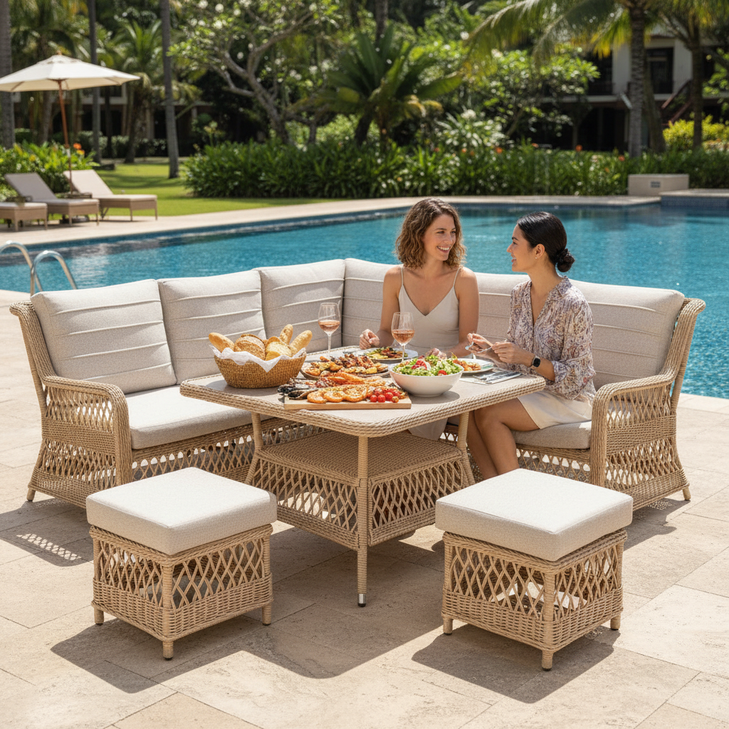 High strength full & half round wicker supported by aluminium frame, and also featuring 3D printed ceramic glass table top, back cushions with horizontal