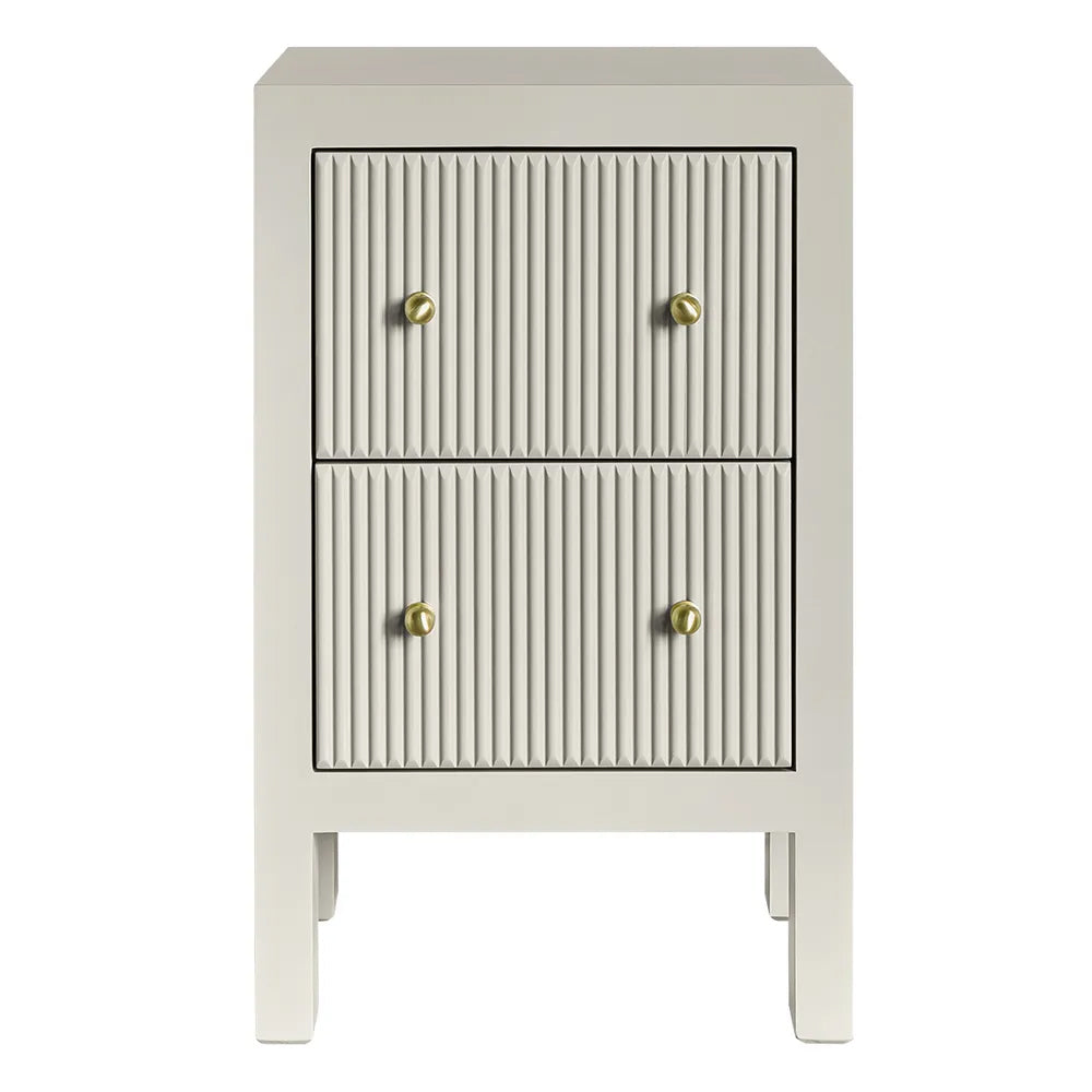 The Ariana Bedside Table Petite Grey offers a balance of compact elegance and practical storage. Finished in a soft grey tone, its refined silhouette is lifted on slender legs for a light, contemporary presence. Two drawers with vertical fluted detailing glide smoothly on durable metal runners, complemented by brushed brass knobs for a sophisticated accent. Designed to suit smaller spaces, the Ariana combines timeless style with everyday functionality, making it a versatile addition to both modern and classic bedroom interiors.
