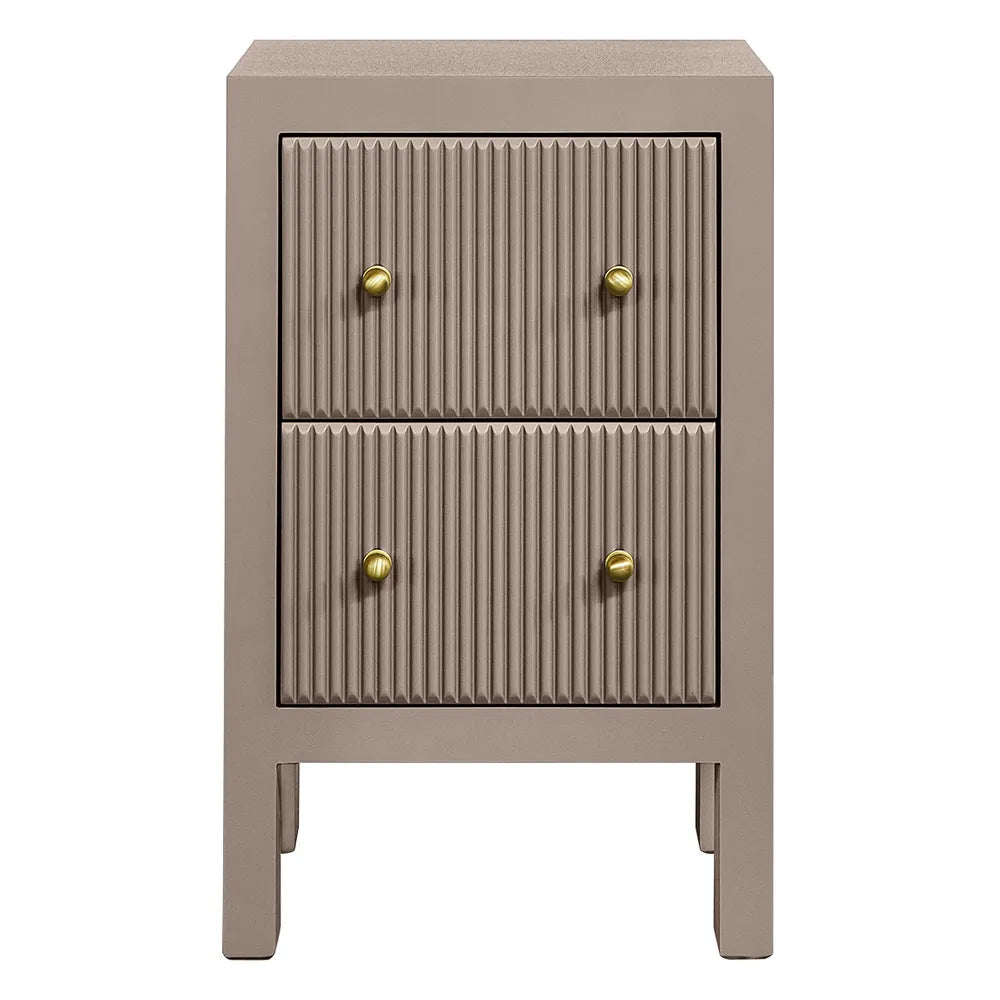 The Ariana Bedside Table Petite Taupe delivers understated elegance with a versatile, modern edge. Finished in a warm taupe tone, its compact profile is raised on slender legs for a light, contemporary look that enhances smaller spaces. Two drawers with refined vertical fluted detailing glide smoothly on durable metal runners, while petite gold knobs provide a subtle touch of sophistication. Blending timeless style with practical storage, the Ariana makes a graceful addition to bedrooms, seamlessly complementing both modern and classic interiors.