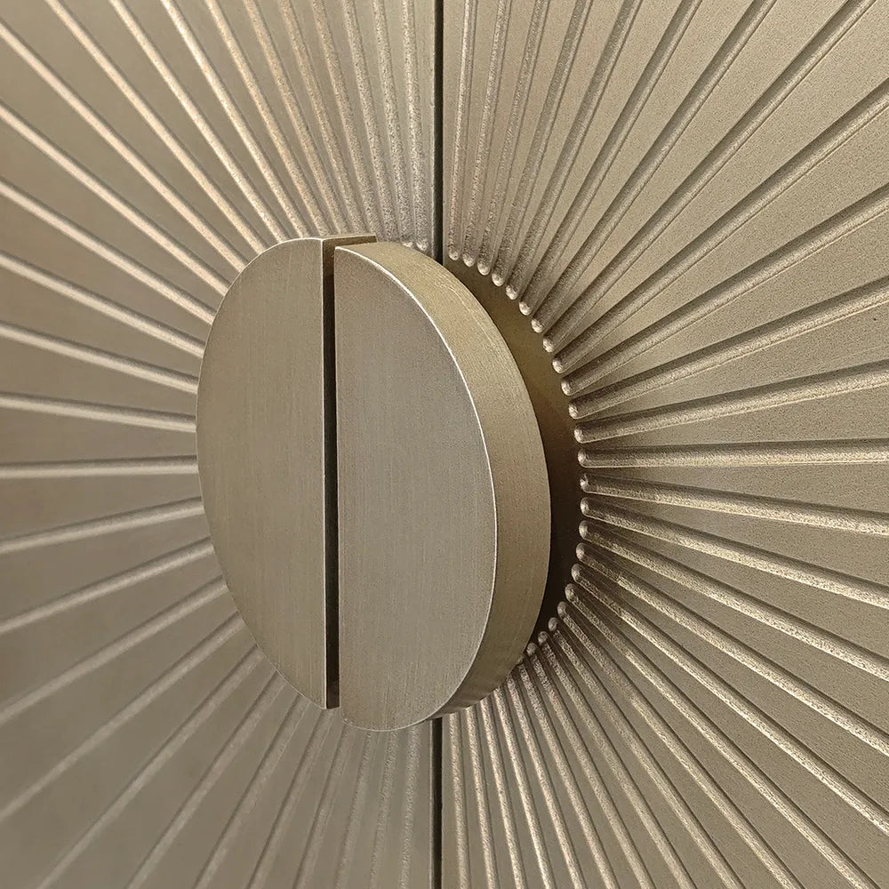 Elevate your entertaining space with the Bonnet Bar Cabinet, a refined statement piece with timeless appeal. Finished in a soft antique gold tone, the cabinet showcases a radiant sunburst design across its double doors, drawing the eye to a sculptural central disc handle. Inside, generous shelving and integrated glassware racks provide smart storage for bottles and barware. Resting on a sleek geometric base, Bonnet combines functionality with bold Art Deco influence. Perfect for dining areas or living spaces, it offers a luxurious focal point while keeping your entertaining essentials stylishly concealed.