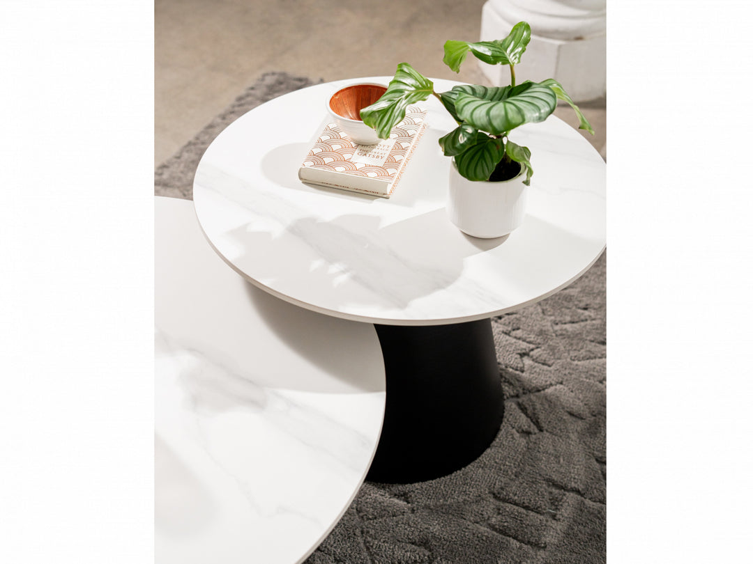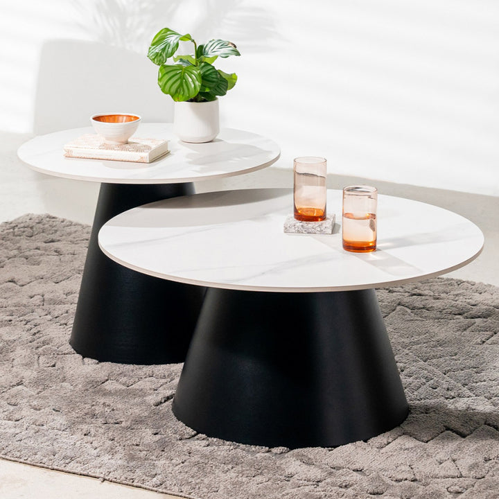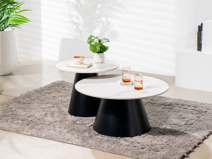 Warm up your living space with the stylish and functional 2 Piece Kellen Nesting Coffee Table Set. With its ceramic top in a snow white hue, this coffee table nest adds a touch of elegance to any room. Crafted with durability in mind, the ceramic top of this coffee table nest is scratch and heat resistant, making it the perfect surface for your everyday needs. Say goodbye to worrying about hot cups damaging your table or leaving unsightly marks. Our ceramic top is designed to withstand daily use, ensuring that your coffee table nest will stay looking pristine for years to come.