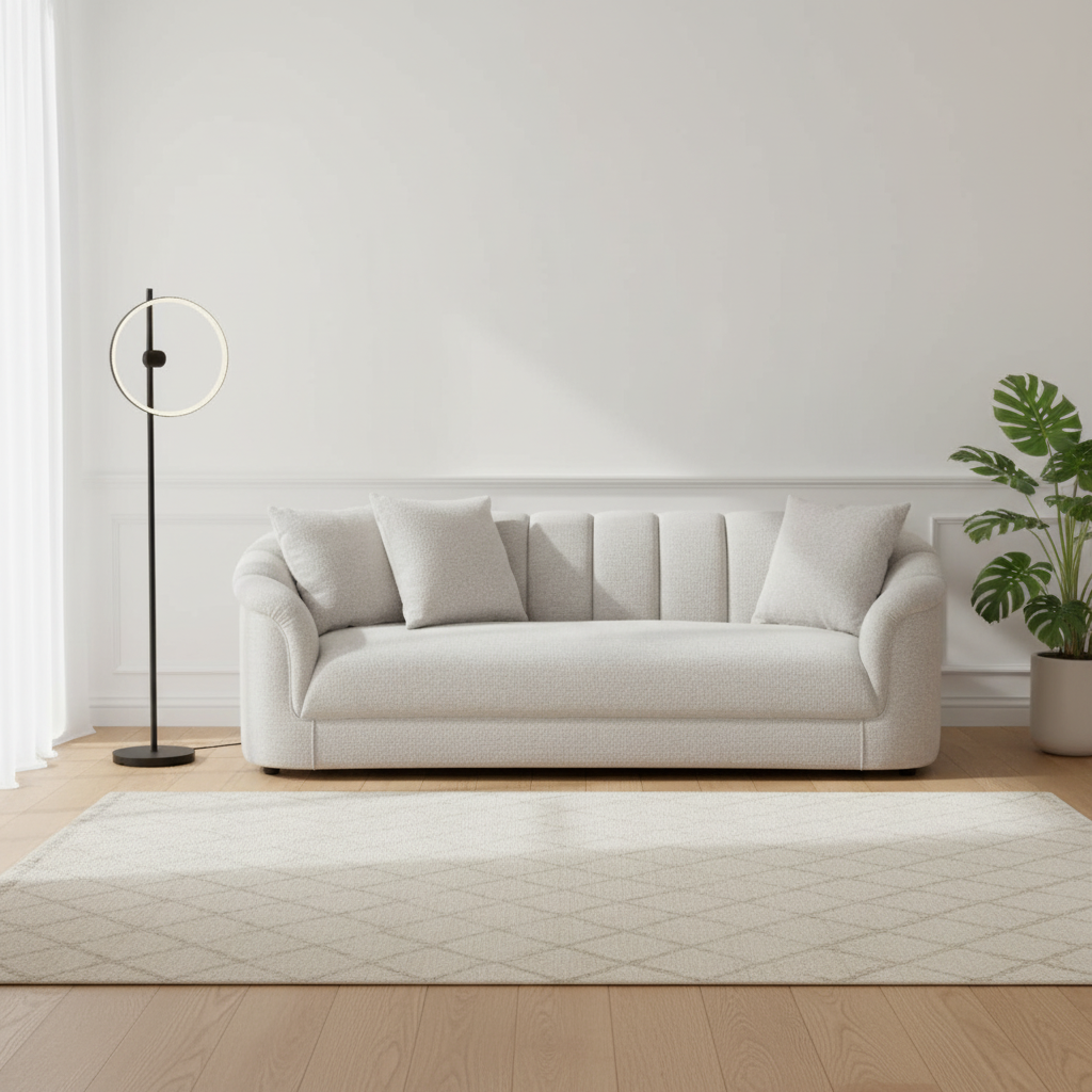 The Davis 3 Seater Fabric Sofa features elegant curved arms and vertical channelling on the backrest for a sculptural look.