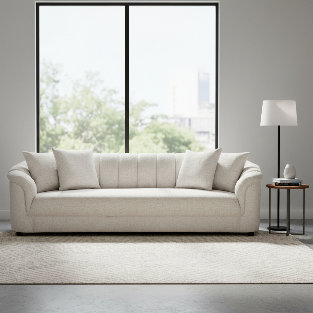 The Davis 4 Seater Fabric Sofa features elegant curved arms and vertical channelling on the backrest for a sculptural look.