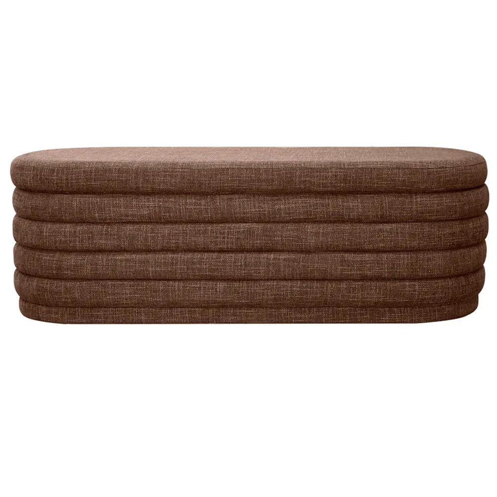 Infuse a grounded, sophisticated ambiance into the versatile Demi range with the Demi Storage Bench Ottoman, upholstered in rich chocolate fabric. Its soft curves and panelled detailing craft a refined silhouette, while the deep hue adds warmth and depth to any setting. Featuring a lift-up lid that unveils generous hidden storage, it effortlessly combines elegance with practicality. Available in a curated selection of colours and fabric finishes to complement a wide range of interior styles.