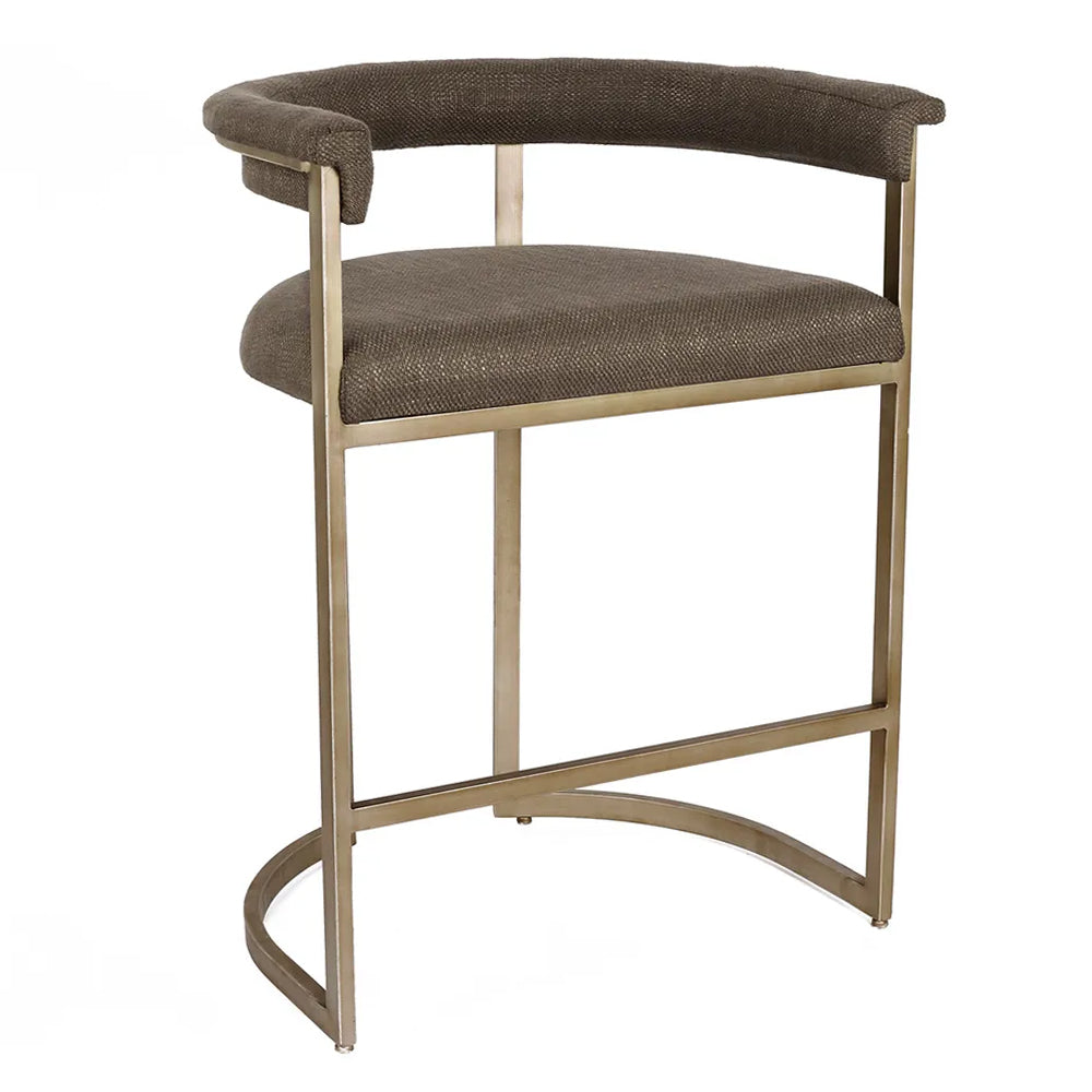 Perfectly proportioned for kitchens and counter-height spaces, the Dino Kitchen Stool brings a bold yet sophisticated touch to modern interiors. Designed for both comfort and style, its luxurious chocolate linen upholstery is neatly tailored over a curved backrest and cushioned seat, ensuring an inviting seating experience. The antique gold-finished frame creates a striking contrast, adding a refined elegance while providing exceptional durability and stability. A seamless blend of contemporary design and timeless appeal, this stool enhances modern kitchens, stylish bars, and high-end dining areas with effortless sophistication. Also available in Black and Natural linen upholstery to complement a range of interior aesthetics.