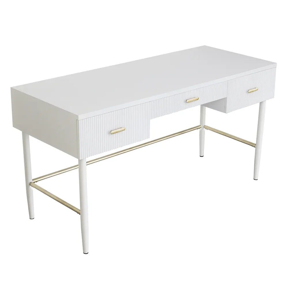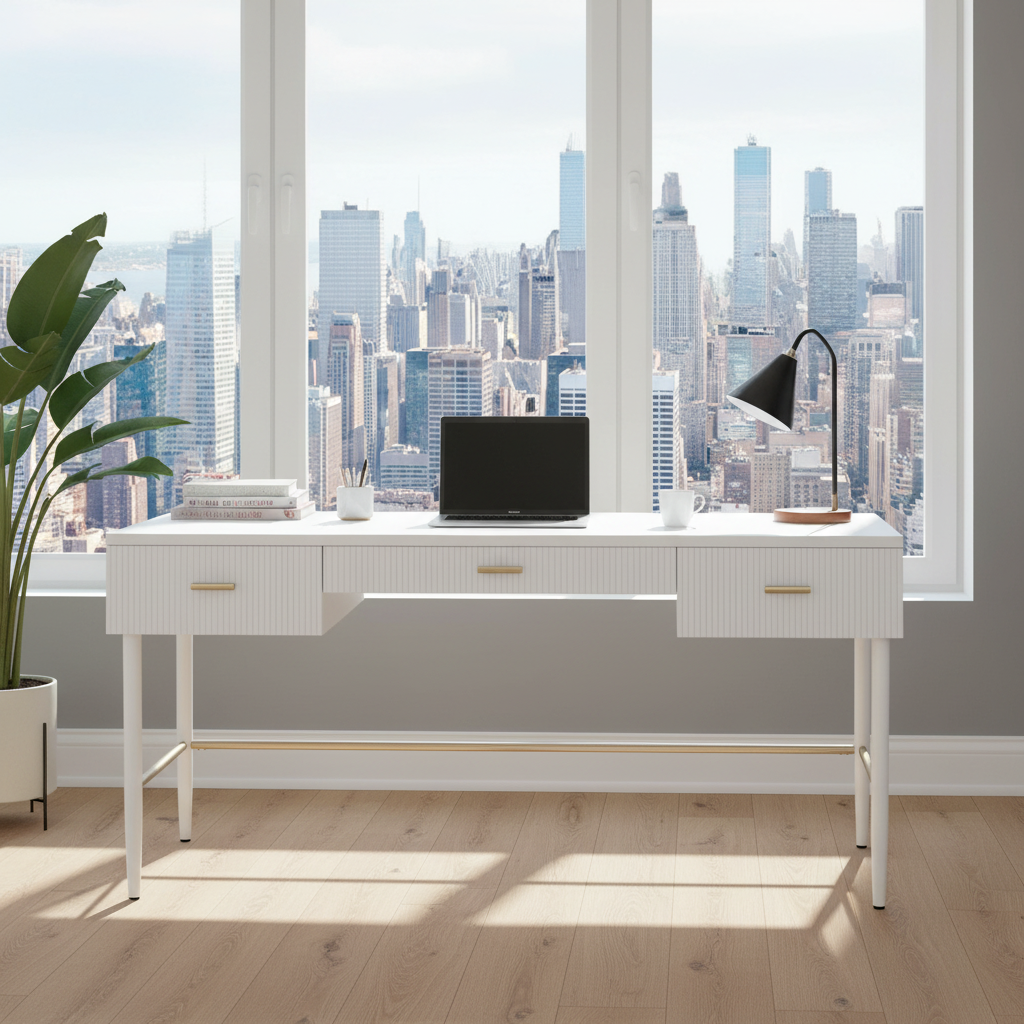 The Evelyn Desk offers a refined fusion of elegance and function, ideal for contemporary workspaces or sophisticated dressing areas. Featuring fluted drawer fronts that add depth and texture, the desk is finished in a clean white tone with sleek cylindrical legs and brushed brass detailing. Three spacious drawers provide practical storage for stationery, tech accessories or beauty essentials, each with smooth-glide runners and streamlined brass handles. Its understated design suits both minimalist and classic interiors. Also available in black for a striking, modern contrast that complements a range of interior schemes.