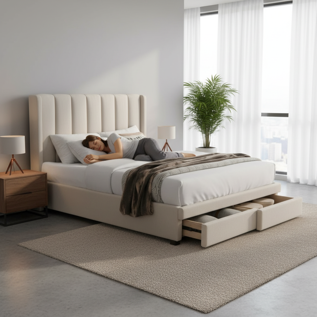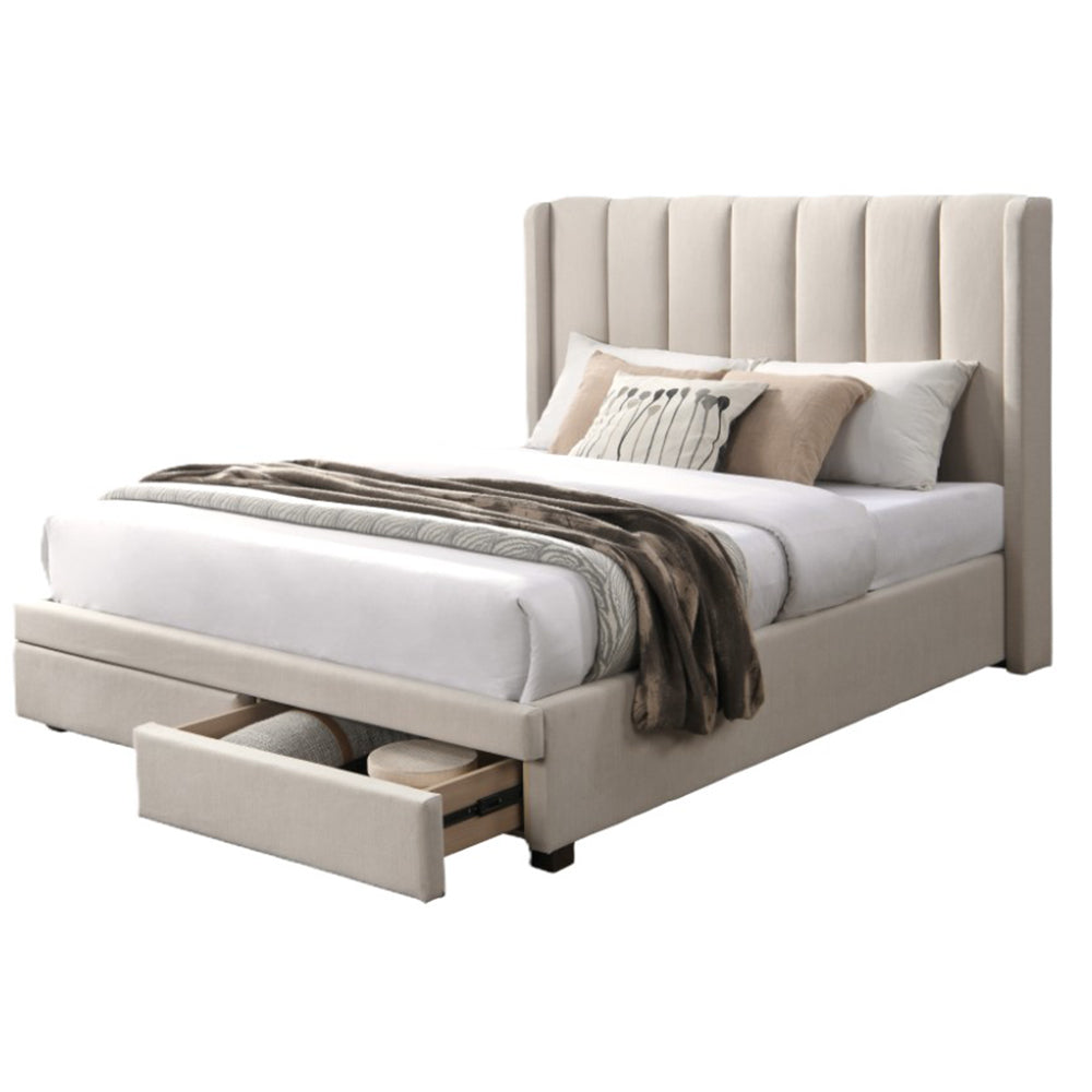 The Fay King Bed with End Drawers features plush fabric bed with vertical channel and winged headboard. Space saving functionality and understated classic style. Two spacious drawers on foot end have metal extension runners.