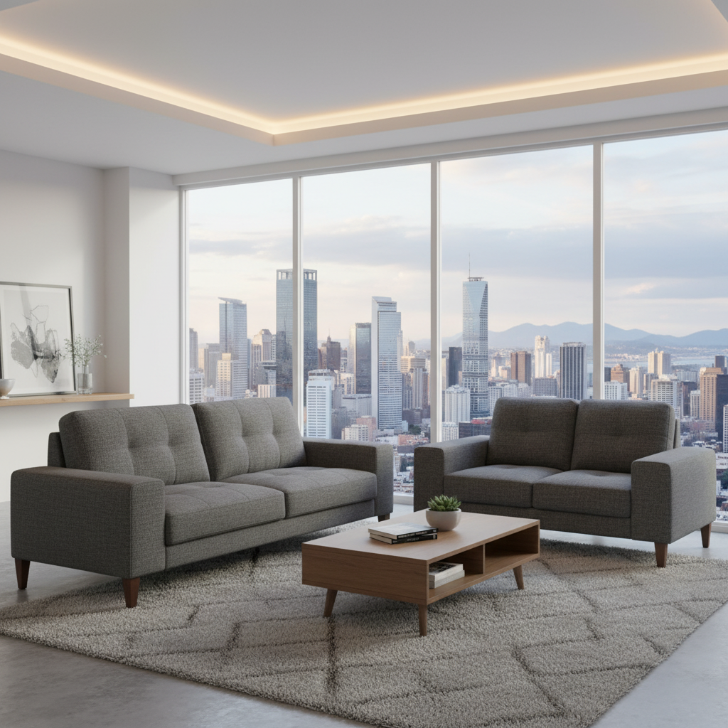 The Mid-century styling with fine tufting details and square frame for a modern touch is a feature of the Gabriel 3-Seater + 2-Seater Fabric Sofa Set. Upholstered in high performance polyester fabric in dark grey colour for earthy appeal. Sturdy construction elevated with strong timber legs in walnut finish.