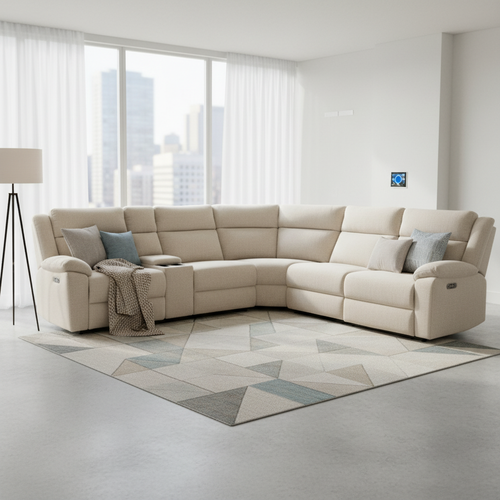 The Glebe 5 seater corner modular lounge consists of LHF+RHF electric recliner, storage console with tray, 2x armless seats and a corner seat.