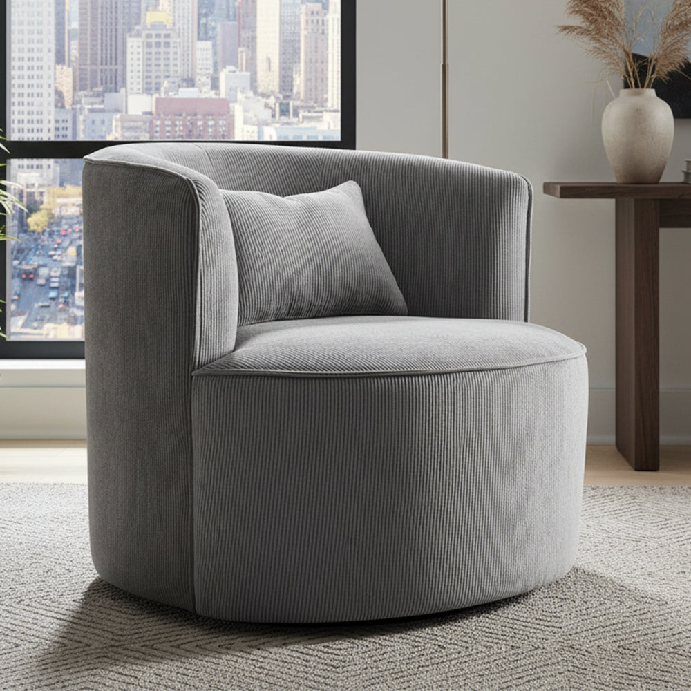 The Gwen Armchair Chair merges stylish aesthetics with superior comfort. Its round seating and mid-high support offer you hours of relaxation, making it a must-have piece for any modern home. The Gwen Chair is tailored with a compact design in mind, ideal for creating a snug corner in any room. Its swivel feature and minimal design allow for easy positioning, making it a go-to choice for smaller spaces. The Gwen Chair showcases a robust eucalyptus wood frame complemented by a stainless steel swivel base. The dense foam padding and polyester corduroy upholstery offer durability and comfort, ensuring you enjoy this chair for the long haul.