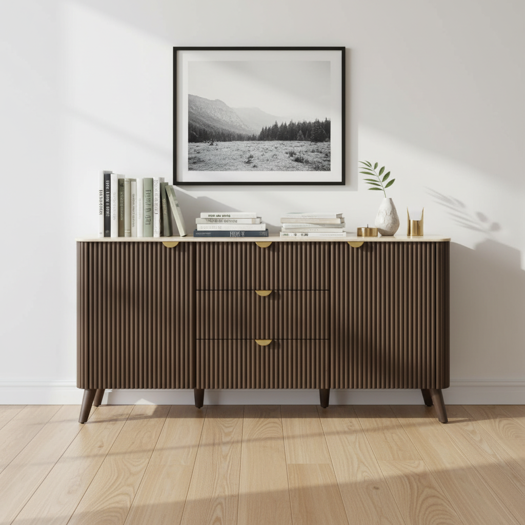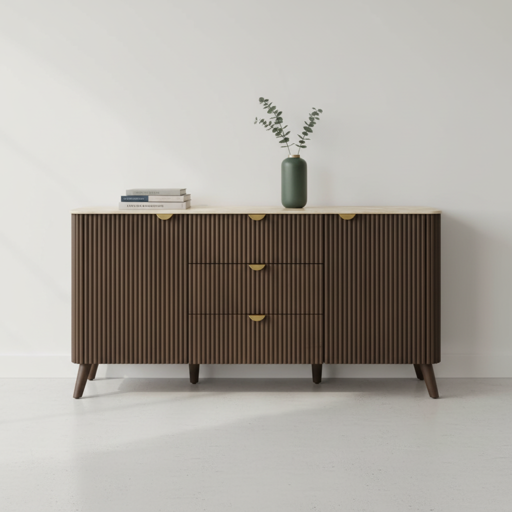 The Harley Buffet features a sleek and modern design with durable sintered stone top, which is scratch and stain resistant for easy maintenance.