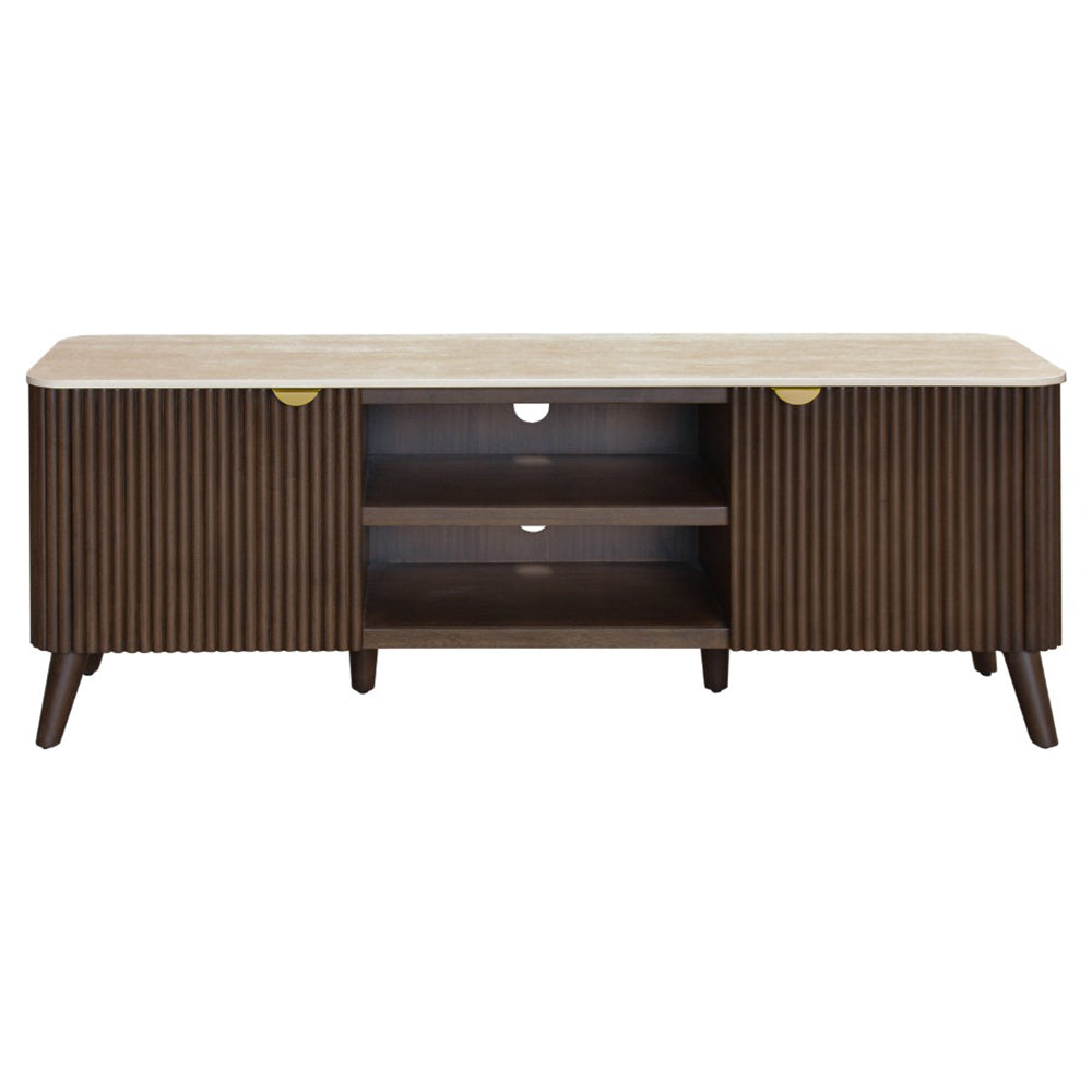 The Harley TV Entertainment Unit features a sleek and modern design with durable sintered stone top, which is scratch and stain resistant for easy maintenance.