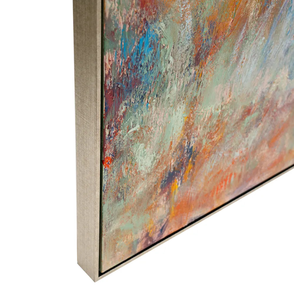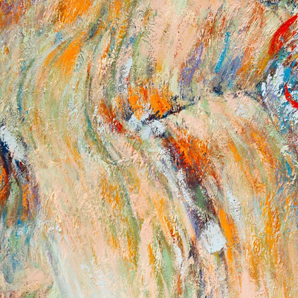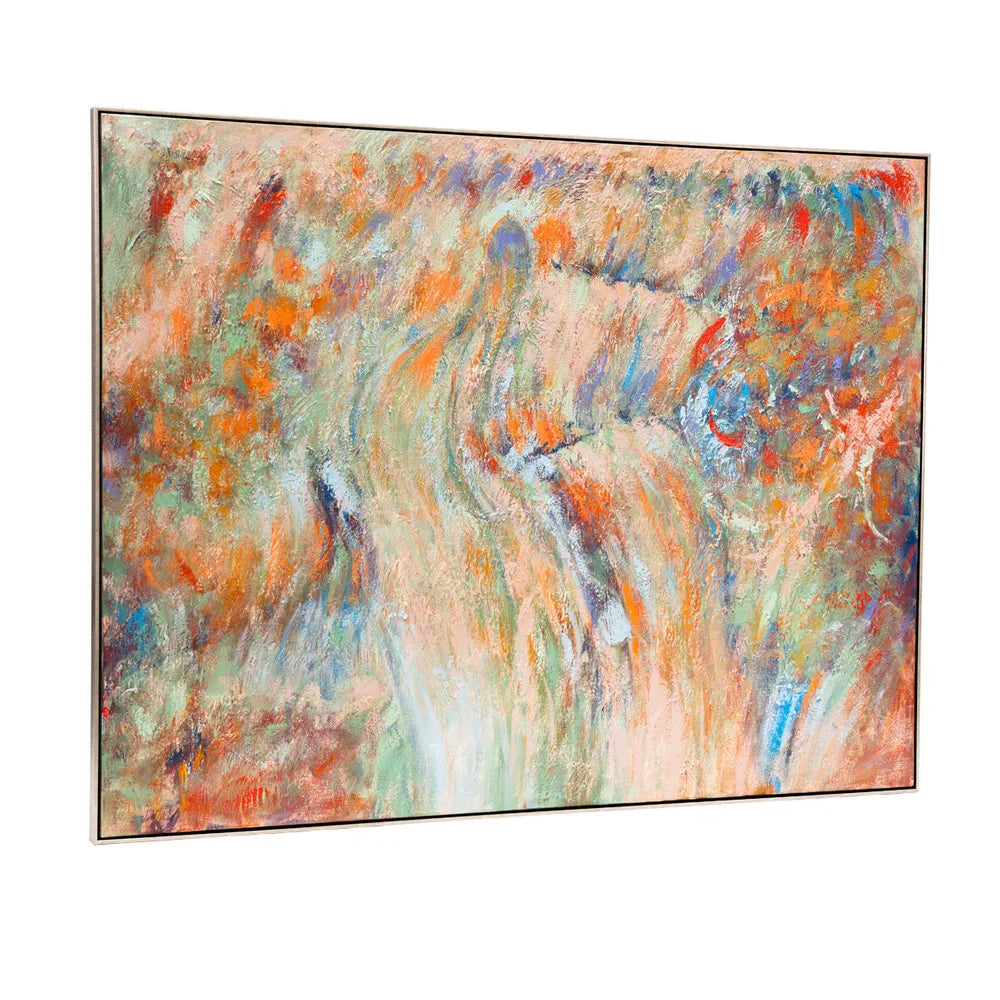 The "Into The Woods Oil on Canvas Painting" is a mesmerizing masterpiece that effortlessly fuses the world of abstract impressionism. Crafted with meticulous skill by talented artisans, this artwork is complemented by an antique silver frame that accentuates its timeless allure. With substantial dimensions of 180cm in width and 140cm in height, this vivid painting displays a captivating palette of oranges, reds, electric blue, and light green, making it a striking centerpiece in any interior setting.