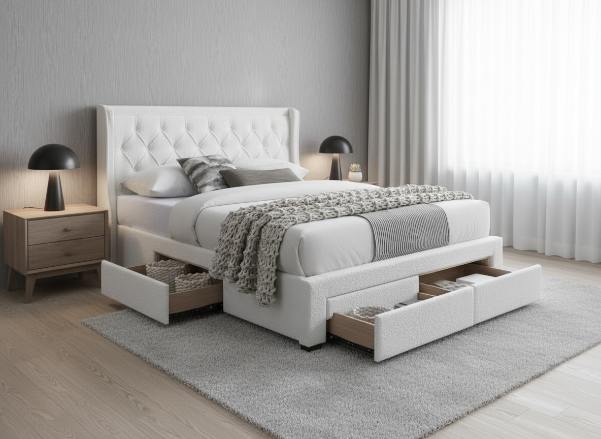 Featuring winged bedhead with button tufting and diamond shape seam details the Jackson 4-Drawer Queen Bed in Ivory Boucle is a stunning addition to any bedroom setting. The Jackson is fully upholstered in soft polyester fabric with four storage drawers with metal extensions runners, rubberwood legs, strong slats and central support provide lasting comfort.