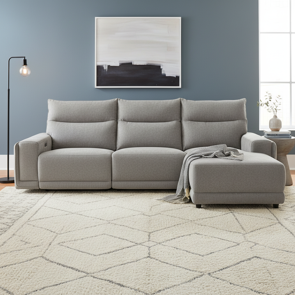 Plush cushioning, wide armrests, and high backrests for added comfort as well as soft, high-performance fabric upholstery and also features of the Kenny Fabric Recliner Sofa with Chaise.