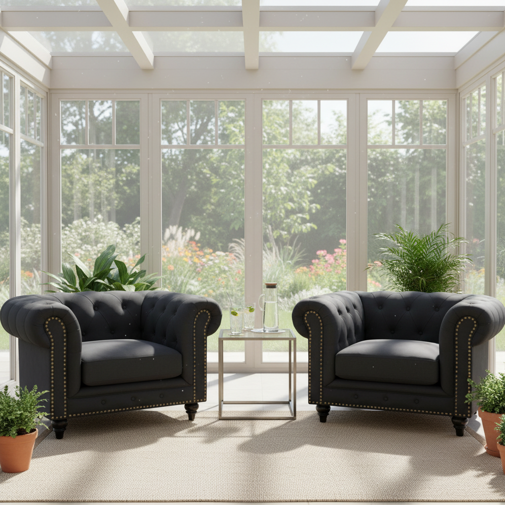 Savour the paramount comfort of the Landon Chesterfield Armchair, with its deep-set seat and rolled arms enveloped in opulent fabric upholstery, elevating any room with a hint of extravagance. The Landon Chesterfield Armchair captivates with its classic button-tufted design and antique brass-finished upholstery tacks, radiating an ageless allure. This statement piece brings an elevated level of class to any setting. With its robust timber legs finished with a stained touch and high-quality upholstery, the Landon Armchair is not just beautifully crafted but made to endure.