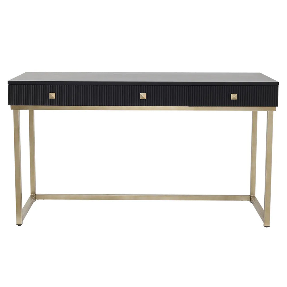 Bold and elegant, the Marc Desk in black offers a dramatic update on a classic silhouette. Featuring fluted drawer fronts with brushed gold knobs and a slender gold-toned base, this desk brings depth, texture and contrast to any room. Its three drawers provide ample storage for office essentials or everyday clutter, while the minimalist frame maintains an open, airy feel. Perfect for a hallway, study or workspace, the Marc Desk blends modern functionality with a luxurious, design-led aesthetic.