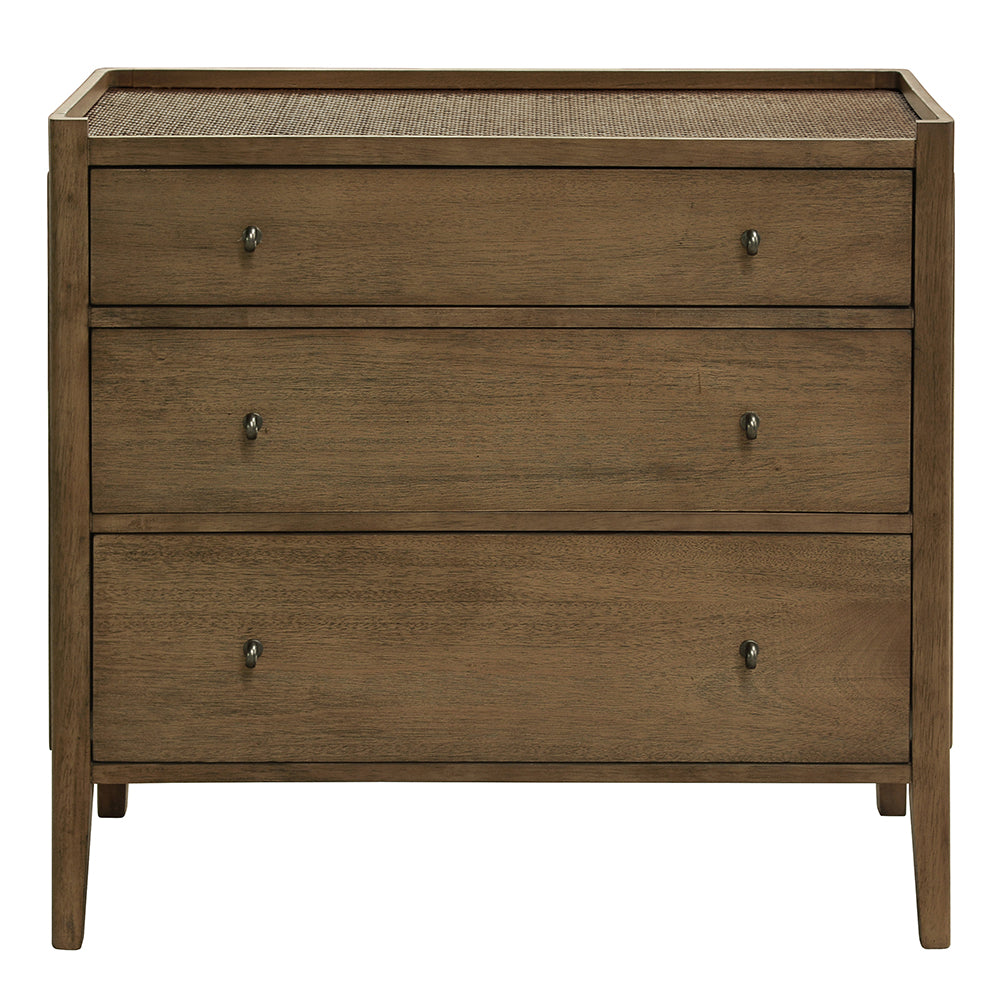 The Marina Dresser is a handsome solution for all your storage needs, combining style and functionality in one striking piece. Crafted from sturdy, sustainably harvested Bayur wood, it features three large equally sized drawers, providing ample space for your belongings. The recessed top showcases a natural rattan weave finish, adding texture and charm to its design. Vertical ring pull handles in antique brass enhance the dresser’s elegant aesthetic, while subtly tapered legs contribute to its sophisticated silhouette. The sleek look and simplicity of the Marina Dresser make it versatile enough to complement both traditional and contemporary environments. This stylish piece not only keeps your space organised but also serves as a stunning focal point in your bedroom or living area.