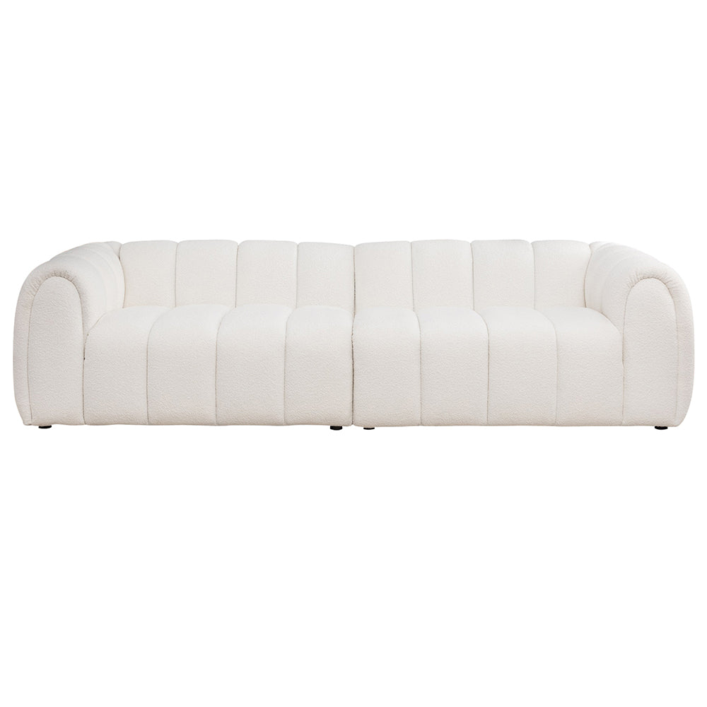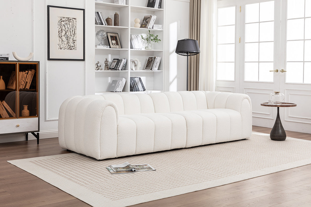 The Marshmallow 4-seater sofa features simple, natural white Boucle fabric, renowned for its soft and plush texture, which provides exceptional comfort. Its easy-care nature, requiring only a simple wipe, makes it ideal for Australian homes.