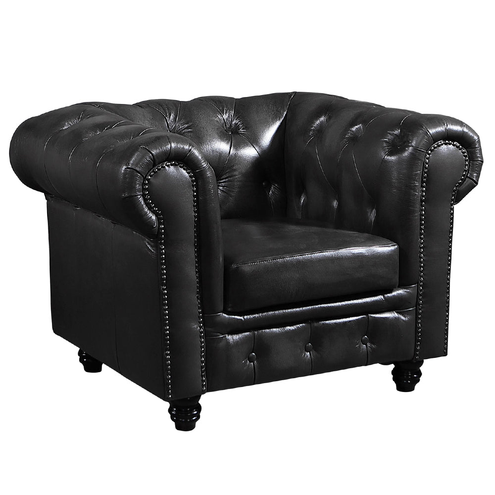 Upholstered in premium quality genuine leather for durability and luxurious good looks Effortlessly chic Chesterfield style provides your space with the gorgeous fusion of contemporary luxe and refined, classic good looks for a sophisticated finish Comes with a spacious seating that can accommodate up to two persons with ease Rolled arm, deep Romsey quilting on the cushions, and button studded design uplifts the look of any modern décor Equipped with revolutionary pocket coil springs that provides every square inch of your back and body enhanced comfort and support Elegant accent piece provides functionality and can easily become the focal point of any home.