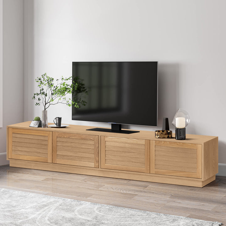 The Motive Timber TV Entertainment Unit stands out with its minimalist yet sophisticated design. The horizontal slatted doors add a subtle texture, breaking the monotony of the sleek white finish and adding visual interest.