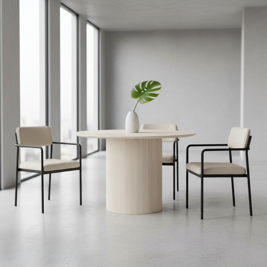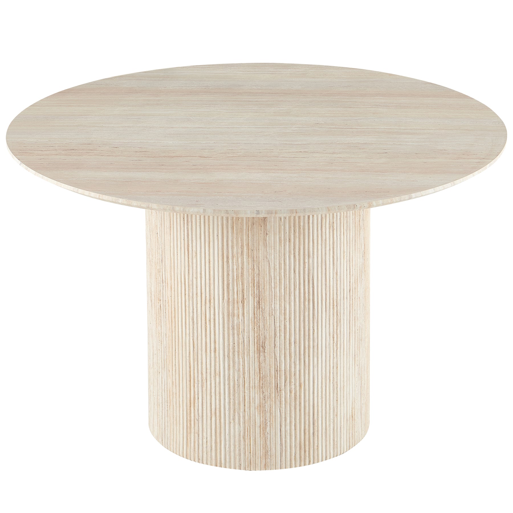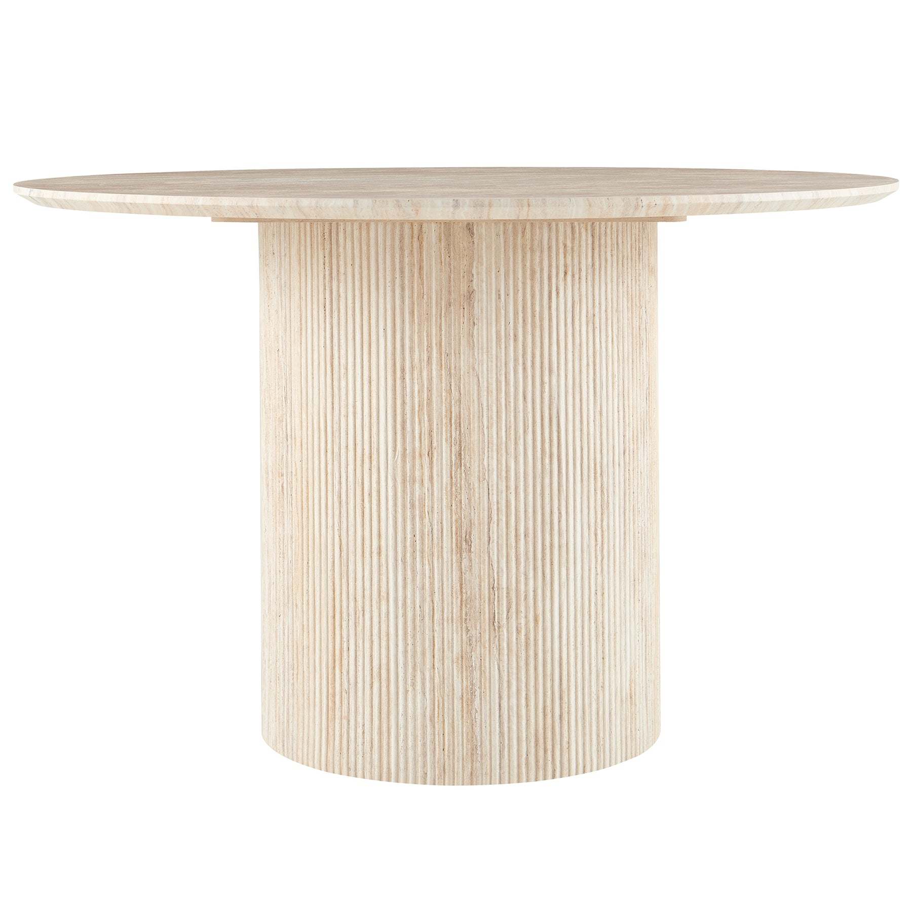 Transform your dining space with the luxurious travertine-look tabletop, adding sophistication and style to your home.