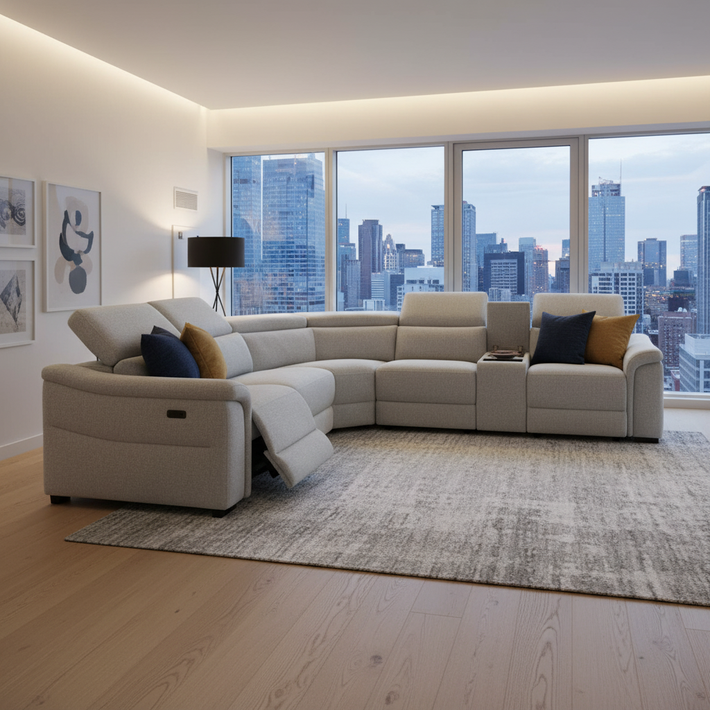 The Robertson Fabric Corner Recliner Sofa is a corner modular lounge with end electric recliners, storage console with tray, 2x armless chair & corner seat.