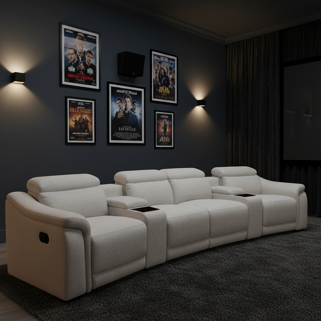 This four seater home theatre lounge consists of four electric recliners and two console with black trays.