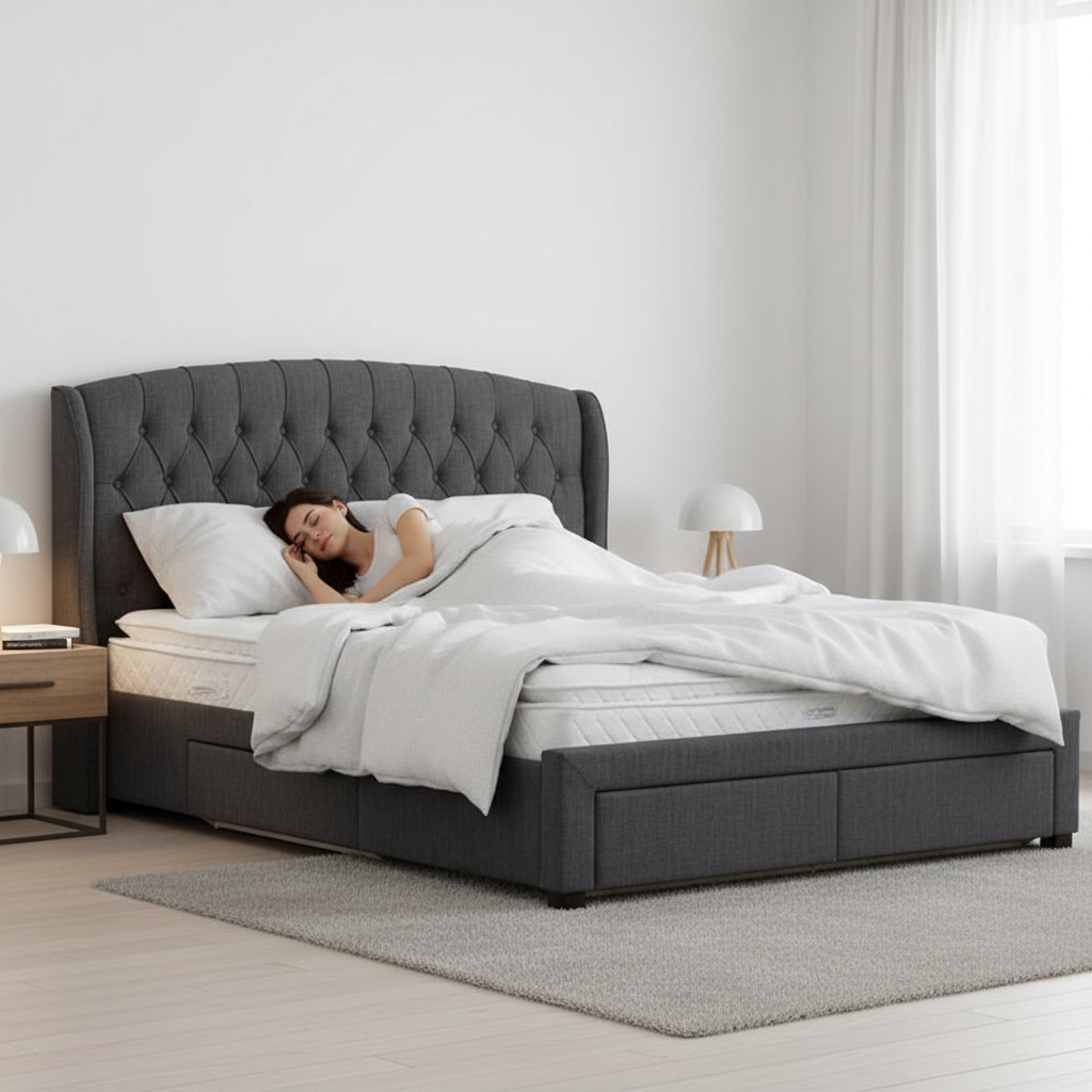 Transform your bedroom style with a Rutherford King Fabric Bed with Drawers – Charcoal and discover high-grade quality. With its charming nature, infuse your space with its urban chic design and create a modern vibe in the home. Comes standard with 4 under bed storage drawers.