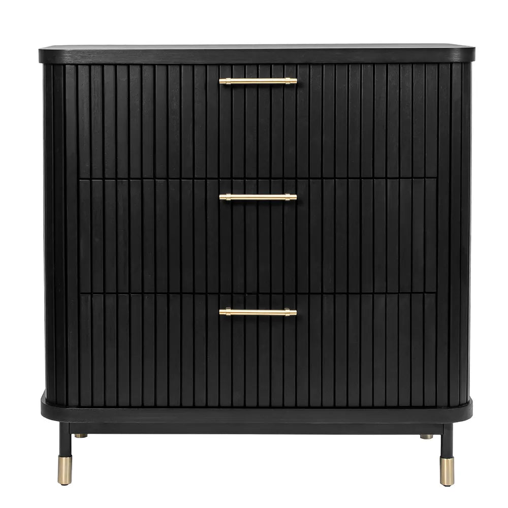 The Sophia 3 Drawer Chest in black combines contemporary elegance with practical storage, making it a versatile choice for both residential and commercial interiors. Its bold fluted façade, finished in painted black, creates a striking statement, while three spacious drawers glide smoothly on soft-closing runners for seamless functionality. Slim brass handles and brass-capped legs add a refined touch of luxury, enhancing its timeless appeal. Perfect for bedrooms, living spaces or boutique projects, this chest balances form and function. Also available in white and natural oak finishes.