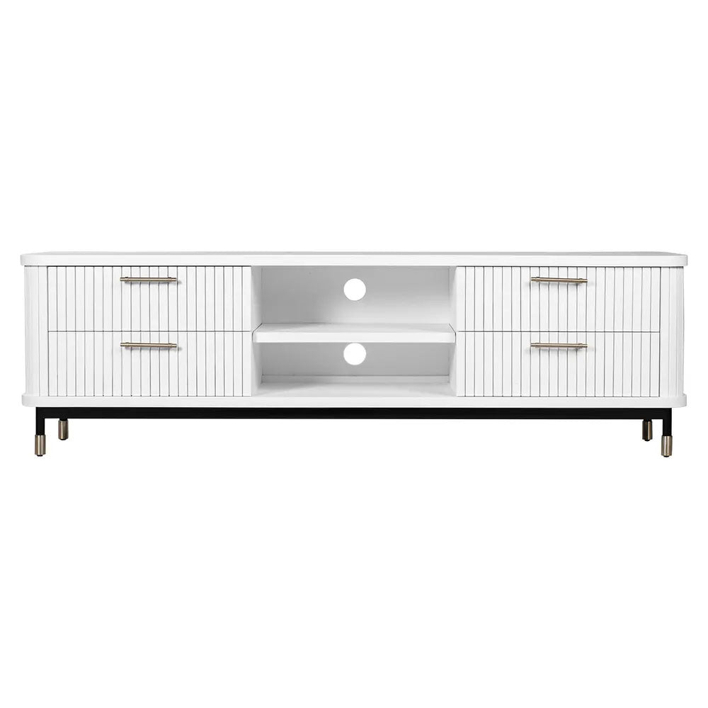 The Sophia Entertainment Unit in White blends functional design with modern refinement, offering a sleek storage solution for contemporary living rooms. Featuring fluted drawer fronts, slim gold handles, and brass-capped legs, it introduces a fresh architectural elegance. Four drawers and two open shelves provide generous space for media components, while a rear cable hole with matching grommet ensures a clutter-free setup. Its crisp white finish enhances light-filled interiors, with versatile colour options also available in Black and Oak Natural.