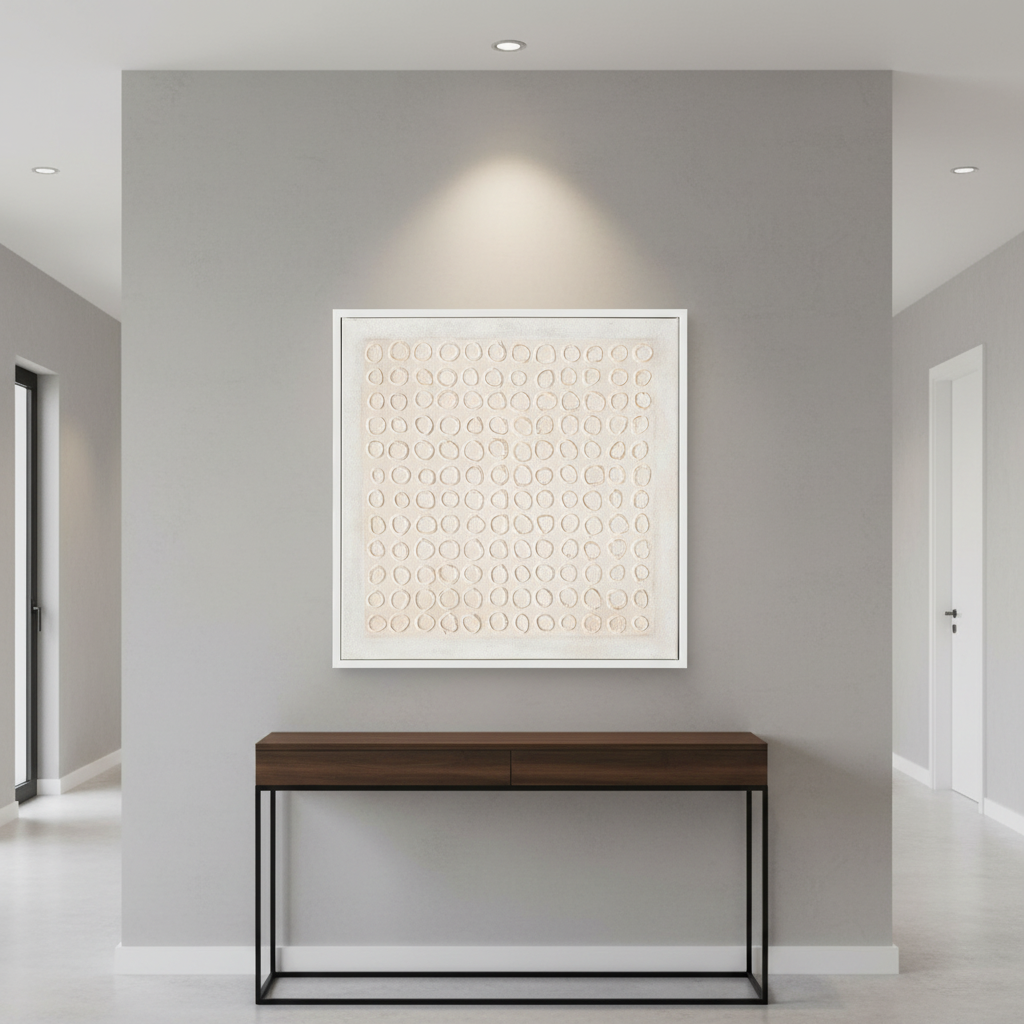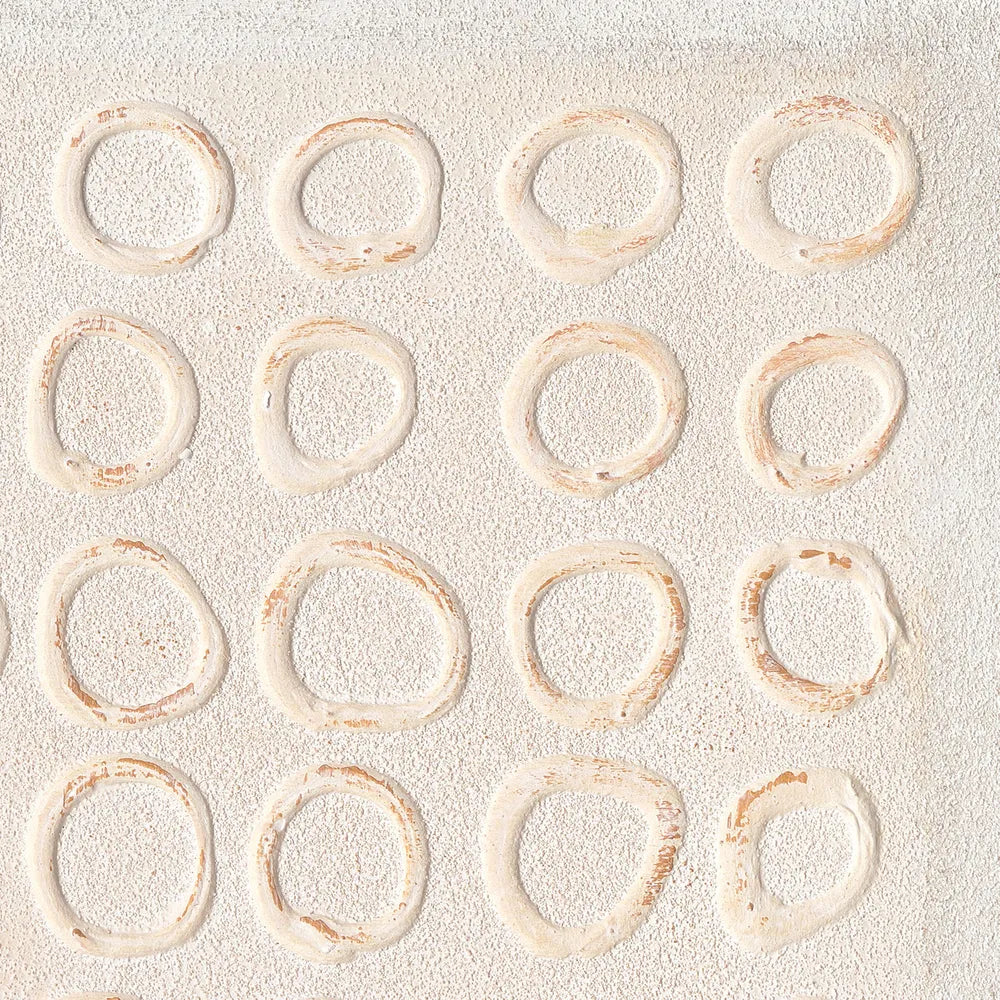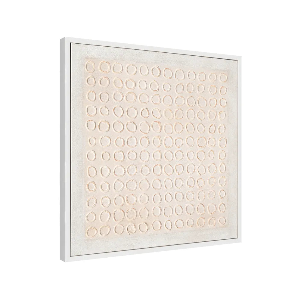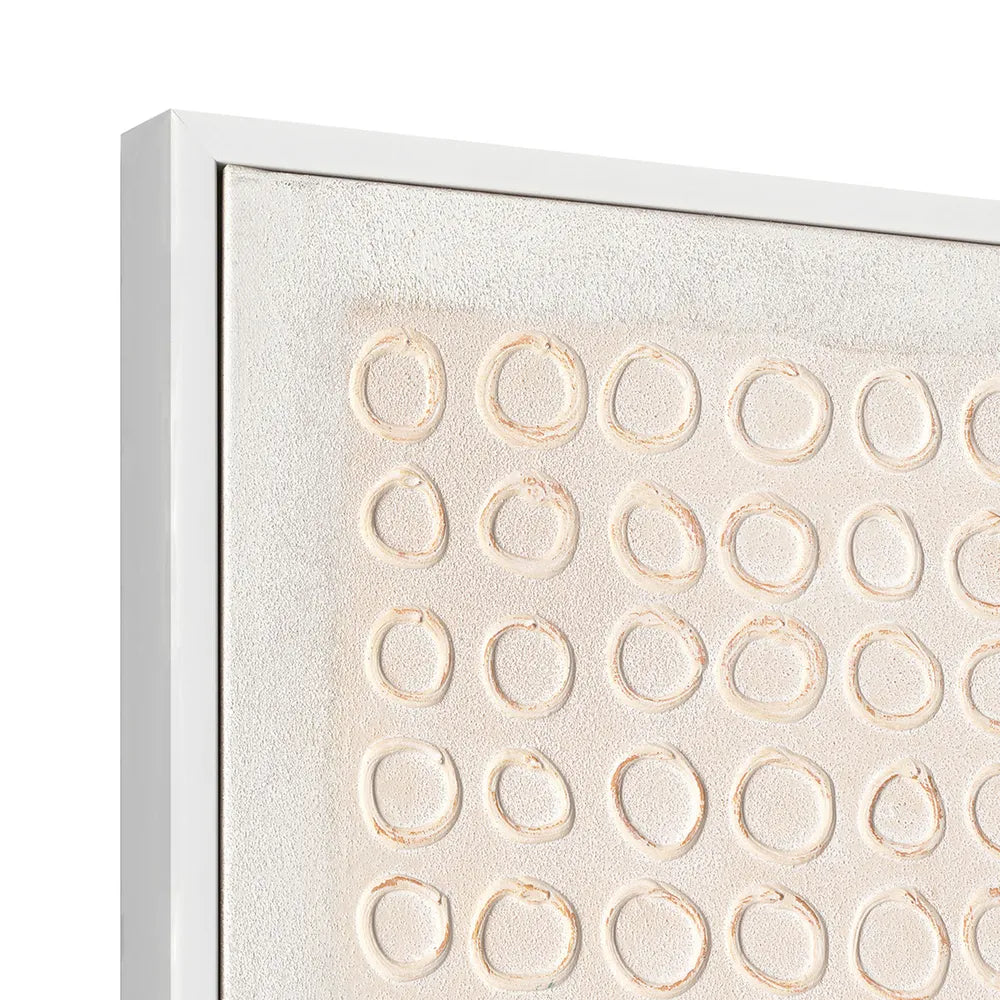 Celebrate the beauty of simplicity with the Unwritten Canvas Painting. Hand painted with 100% acrylic on canvas, this captivating piece features a soft, neutral palette and circular relief detailing that adds subtle dimension and rhythm. Each imperfect circle is intentionally organic, creating a tactile, textural effect that feels both refined and expressive. Set within a sleek white frame, this artwork brings a calming presence to contemporary interiors. Whether styled solo or as part of a gallery wall, its understated elegance and artisan quality make it a timeless addition to your space.