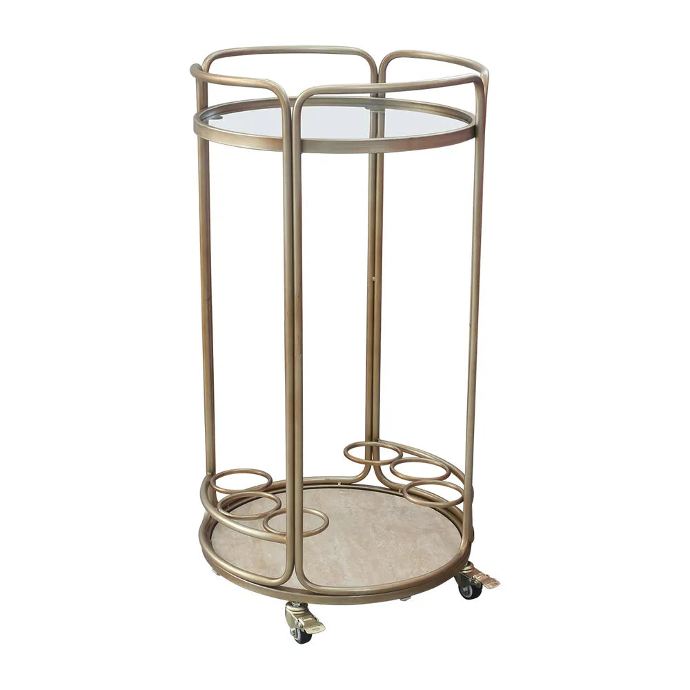 Striking yet timeless, the Wentworth Round Bar Cart in Antique Gold adds classic glamour to any interior. Featuring a brushed metal frame with sculptural circular detailing and a mirrored glass base, it offers generous storage for bottles and glassware. Smooth castors ensure effortless mobility, making it as functional as it is stylish. A statement piece designed for elegant entertaining.
