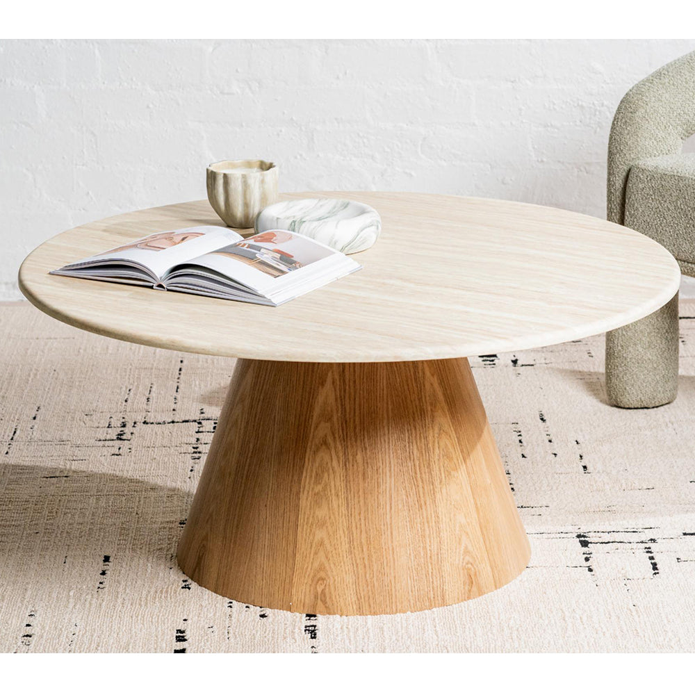 Elevate your home storage experience with this elegant round coffee hall table, featuring a luxurious stone top with a refined travertine finish. The smooth, sophisticated surface brings timeless charm to your living space, while the sturdy corrugated MDF base, finished in a natural ash tone, adds depth and contrast to the design. The Wesley round coffee table's blend of modern style and classic appeal makes it the perfect centerpiece for contemporary home, offering both durability and beauty for everyday use or special occasions.