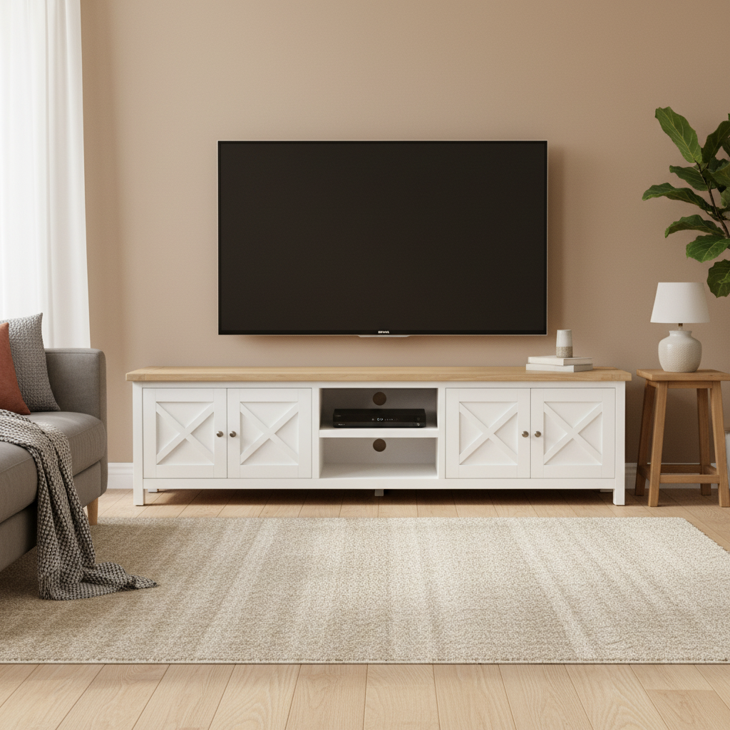 The Widden Timber TV Entertainment Unit features a distinctive bedroom range featuring light oak coloured acacia timber tops and smooth white painted frame.