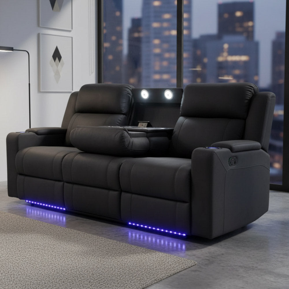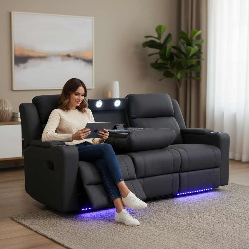 The Wolgan 3-Seater Upholstered Recliner Sofa features a smart cupholder which includes buttons for headrest up/down, rec open/close, base & cupholder light, USB charger. Dual motor for independent function of head rest and recliner plus base light adds to the media room atmosphere. Drop down tray includes Bluetooth player (Bluetooth, USB, AUX, SD and RF input) & speakers (subwoofer included), wireless charger, USB charger, A/C socket, reading light.